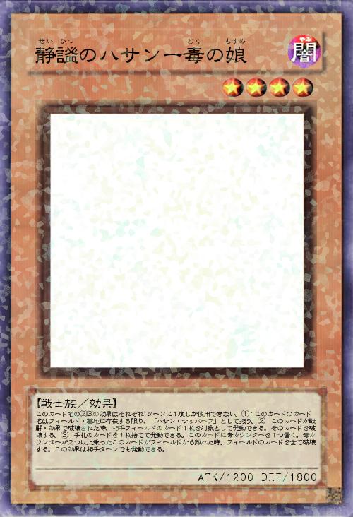 「蒼奏さんコメントありがとうございます。③の効果に関しては他ハサンの②「このカードが戦闘・効果で破壊された時に」のコンボにできます。③の効果は明確にはなかったのですが、静謐の「最悪の場合、自身の肉体を破裂させてその体液の毒を相手に浴びせる」という自爆技をイメージしました。この効果を持ってるだけでも相手としては警戒するし、このカードがそれで破壊されても②で最低限の役割を持てるので結構いいと思います。後はFakeのアサシン、おまけ要素としてちびハサン(百貌の人格の一人)を作るかもです。」(2021-07-31 15:33)