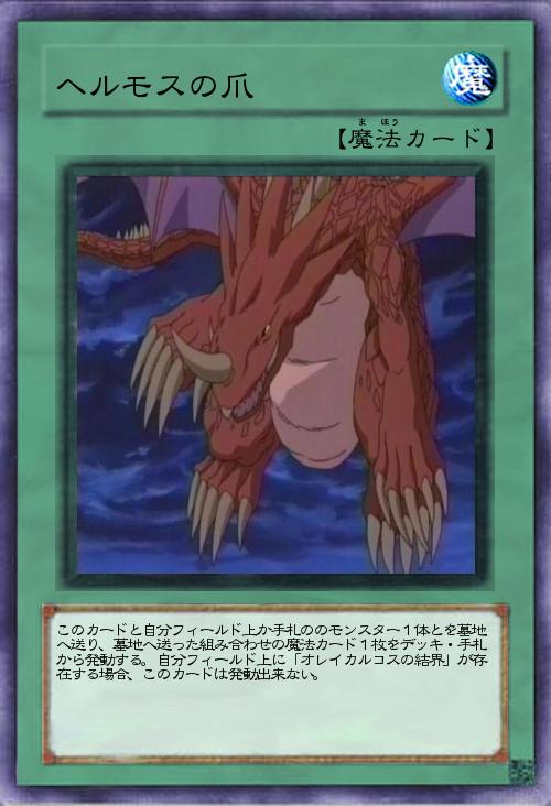 | このカードと自分フィールド上か手札ののモンスター1体とを墓地へ送り、墓地へ送った組み合わせの魔法カード1枚をデッキ・手札から発動する。自分フィールド上に「オレイカルコスの結界」が存在する場合、このカードは発動出来ない。 | |||