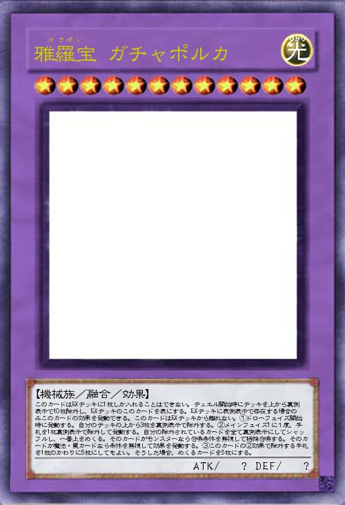 | このカードはEXデッキに1枚しか入れることはできない。デュエル開始時にデッキを上から裏側表示で10枚除外し、EXデッキのこのカードを表にする。EXデッキに表側表示で存在する場合のみこのカードの効果を発動できる。このカードはEXデッキから離れない。①ドローフェイズ開始時に発動する。自分のデッキの上から3枚を裏側表示で除外する。②メインフェイズ1に1度、手札を1枚裏側表示で除外して発動する。自分の除外されているカードを全て裏側表示にしてシャッフルし、一番上をめくる。そのカードがモンスターなら召喚条件を無視して特殊召喚する。そのカードが魔法・罠カードなら条件を無視して効果を発動する。③このカードの②効果で除外する手札を1枚のかわりに5枚にしてもよい。そうした場合、めくるカードを5枚にする。 | |||