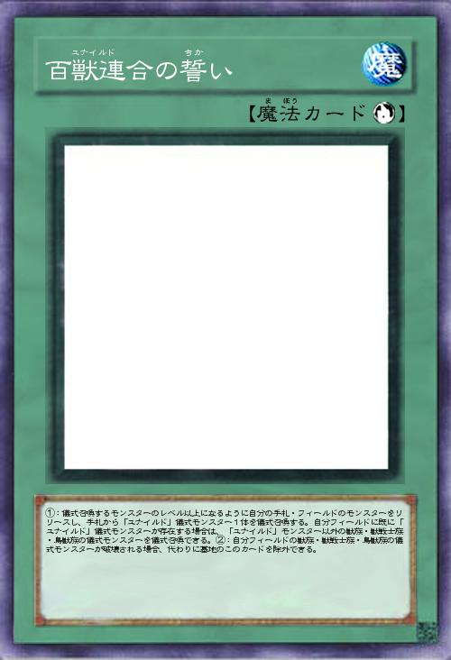 | ①:儀式召喚するモンスターのレベル以上になるように自分の手札・フィールドのモンスターをリリースし、手札から「ユナイルド」儀式モンスター1体を儀式召喚する。自分フィールドに既に「ユナイルド」儀式モンスターが存在する場合は、「ユナイルド」モンスター以外の獣族・獣戦士族・鳥獣族の儀式モンスターを儀式召喚できる。②:自分フィールドの獣族・獣戦士族・鳥獣族の儀式モンスターが破壊される場合、代わりに墓地のこのカードを除外できる。 | |||