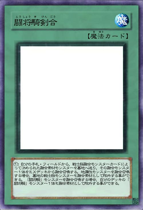 | ①:自分の手札・フィールドから、戦士族融合モンスターカードによって決められた融合素材モンスターを墓地へ送り、その融合モンスター1体をEXデッキから融合召喚する。地属性モンスターを融合召喚する場合、墓地の戦士族モンスターも融合素材として除外する事ができる。「闘将騎」モンスターを融合召喚する場合、自分のデッキの「闘将騎」モンスター1体も融合素材として除外する事ができる。 | |||