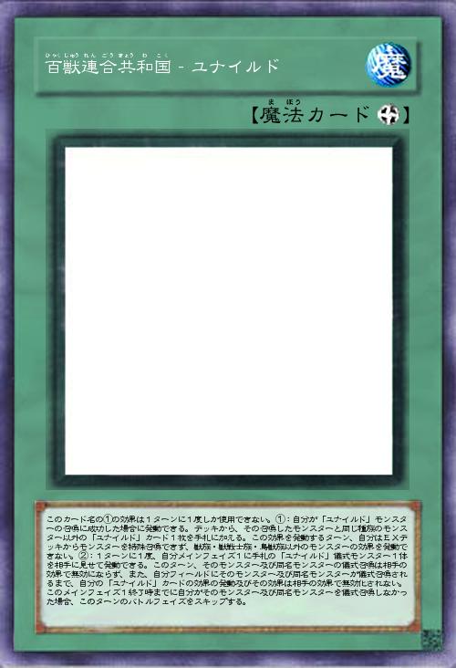 | このカード名の①の効果は1ターンに1度しか使用できない。①:自分が「ユナイルド」モンスターの召喚に成功した場合に発動できる。デッキから、その召喚したモンスターと同じ種族のモンスター以外の「ユナイルド」カード1枚を手札に加える。この効果を発動するターン、自分はEXデッキからモンスターを特殊召喚できず、獣族・獣戦士族・鳥獣族以外のモンスターの効果を発動できない。②:1ターンに1度、自分メインフェイズ1に手札の「ユナイルド」儀式モンスター1体を相手に見せて発動できる。このターン、そのモンスター及び同名モンスターの儀式召喚は相手の効果で無効にならず、また、自分フィールドにそのモンスター及び同名モンスターが儀式召喚されるまで、自分の「ユナイルド」カードの効果の発動及びその効果は相手の効果で無効化されない。このメインフェイズ1終了時までに自分がそのモンスター及び同名モンスターを儀式召喚しなかった場合、 | |||
