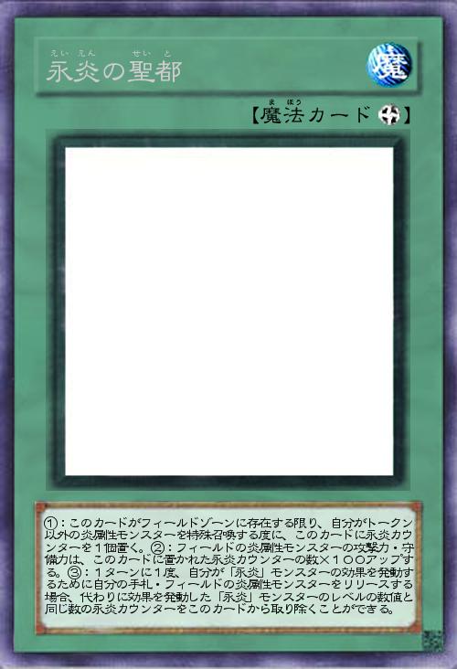 | ①:このカードがフィールドゾーンに存在する限り、自分がトークン以外の炎属性モンスターを特殊召喚する度に、このカードに永炎カウンターを1個置く。②:フィールドの炎属性モンスターの攻撃力・守備力は、このカードに置かれた永炎カウンターの数×100アップする。③:1ターンに1度、自分が「永炎」モンスターの効果を発動するために自分の手札・フィールドの炎属性モンスターをリリースする場合、代わりに効果を発動した「永炎」モンスターのレベルの数値と同じ数の永炎カウンターをこのカードから取り除くことができる。 | |||