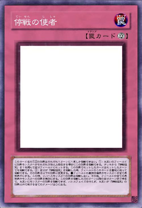 | このカード名の①②の効果はそれぞれ1ターンに1度しか発動できない。①:お互いのフィールドに効果モンスターがそれぞれ3体以上存在する場合にこの効果を発動できる。デッキから「停戦協定」を1枚選んで自分フィールドにセットする。この効果でセットしたカードはセットしたターンでも発動できる。②:自分が「停戦協定」を発動した時、フィールドのこのカードを墓地に送って発動できる。その効果を以下の効果に変更する。●フィールドの裏側守備表示モンスターを全て表側表示にする。この時、リバースモンスターの効果は発動しない。その後、フィールドの全ての表側表示モンスターの効果を無効にする。この効果を発動した次のターン以降の自分ターン終了時まで、お互いにモンスターの効果を発動できず、バトルフェイズを行えず、お互いが「停戦協定」の効果以外で受ける全てのダメージは0になる。 | |||