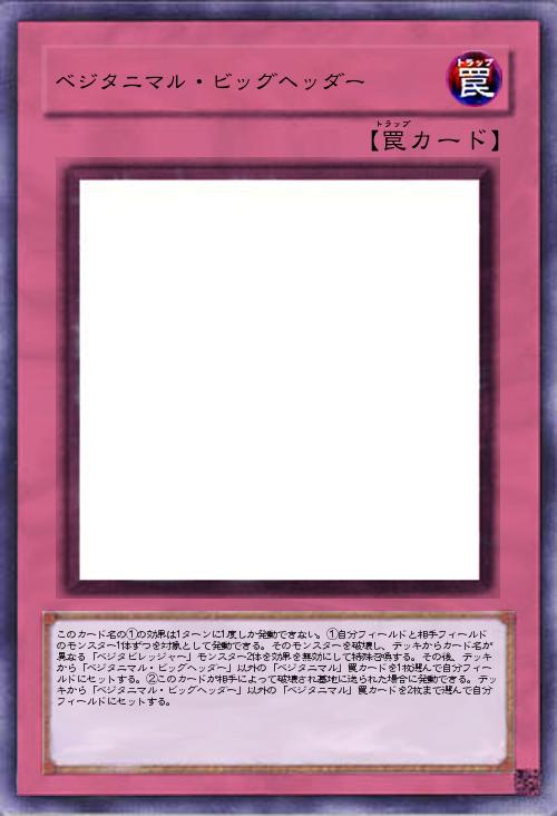 | このカード名の①の効果は1ターンに1度しか発動できない。①自分フィールドと相手フィールドのモンスター1体ずつを対象として発動できる。そのモンスターを破壊し、デッキからカード名が異なる「ベジタビレッジャー」モンスター2体を効果を無効にして特殊召喚する。その後、デッキから「ベジタニマル・ビッグヘッダー」以外の「ベジタニマル」罠カードを1枚選んで自分フィールドにセットする。②このカードが相手によって破壊され墓地に送られた場合に発動できる。デッキから「ベジタニマル・ビッグヘッダー」以外の「ベジタニマル」罠カードを2枚まで選んで自分フィールドにセットする。 | |||
