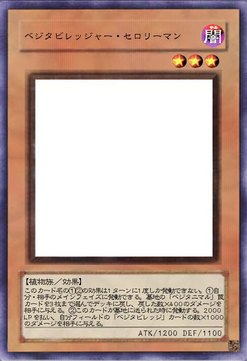 | このカード名の①②の効果は1ターンに1度しか発動できない。①自分・相手のメインフェイズに発動できる。墓地の「ベジタニマル」罠カードを3枚まで選んでデッキに戻し、戻した数×400のダメージを相手に与える。②このカードが墓地に送られた時に発動する。2000LPを払い、自分フィールドの「ベジタビレッジ」カードの数×1000のダメージを相手に与える。 | |||