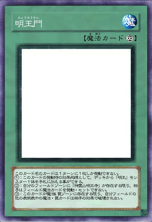 | このカード名のカードは1ターンに1枚しか発動できない。 ①:このカードの発動時の効果処理として、デッキから「明王」モンスター1体を手札に加える事ができる。 ②:自分のフィールドゾーンに「神霊山明王寺」が存在する限り、相手はフィールド魔法カードを発動・セットできない。 ③:このカードが魔法&罠ゾーンに存在する限り、自分フィールドの他の表側表示の魔法・罠カードは相手の効果で破壊されない。 | |||