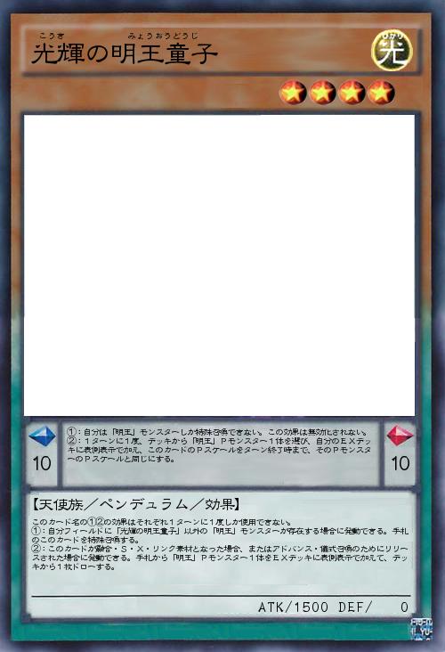 | このカード名の①②の効果はそれぞれ1ターンに1度しか使用できない。 ①:自分フィールドに「光輝の明王童子」以外の「明王」モンスターが存在する場合に発動できる。手札のこのカードを特殊召喚する。 ②:このカードが融合・S・X・リンク素材となった場合、またはアドバンス・儀式召喚のためにリリースされた場合に発動できる。手札から「明王」Pモンスター1体をEXデッキに表側表示で加えて、デッキから1枚ドローする。 | |||
