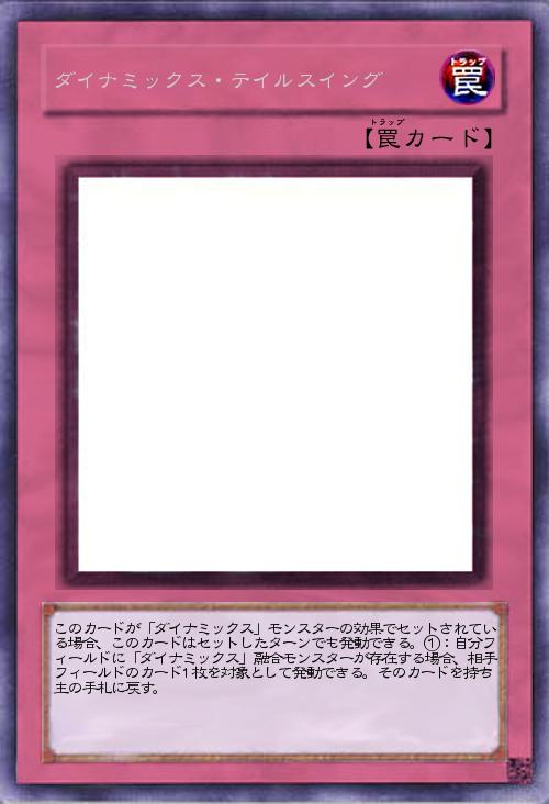| このカードが「ダイナミックス」モンスターの効果でセットされている場合、このカードはセットしたターンでも発動できる。①:自分フィールドに「ダイナミックス」融合モンスターが存在する場合、相手フィールドのカード1枚を対象として発動できる。そのカードを持ち主の手札に戻す。 | |||