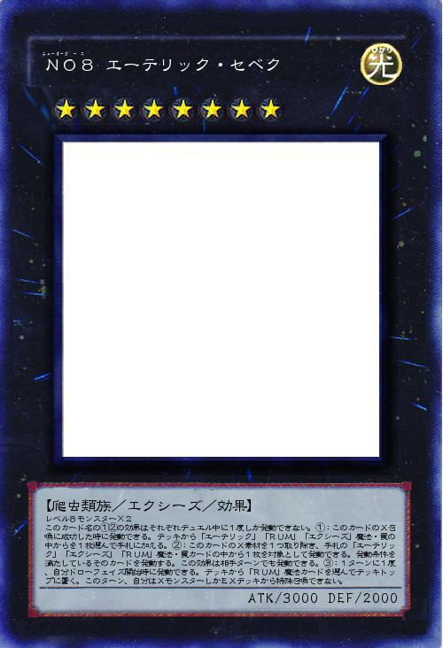 | レベル8モンスター×2 このカード名の①②の効果はそれぞれデュエル中に1度しか発動できない。①:このカードのX召喚に成功した時に発動できる。デッキから「エーテリック」「RUM」「エクシーズ」魔法・罠の中からを1枚選んで手札に加える。②:このカードのX素材を1つ取り除き、手札の「エーテリック」「エクシーズ」「RUM」魔法・罠カードの中から1枚を対象として発動できる。発動条件を満たしているそのカードを発動する。この効果は相手ターンでも発動できる。③:1ターンに1度、自分ドローフェイズ開始時に発動できる。デッキから「RUM」魔法カードを選んでデッキトップに置く。このターン、自分はXモンスターしかEXデッキから特殊召喚できない。 | |||