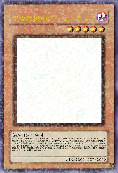 | このカードは特殊召喚としてもできる。このカードは装備カード扱いとして自分フィールド上の甲虫装機とついたモンスターに装備できる。装備されているとき装備モンスターはもともとの攻撃力、守備力が2900となる。このカードを墓地へ送ることで相手フィールド上のカードをすべて破壊する。そのあとデッキ、手札、墓地から5枚まで特殊召喚できる。この効果に対して相手はモンスターの効果、魔法、罠を使用することはできない。装備モンスターはモンスターの効果、魔法、罠の対象にならない。戦闘でも破壊されない。 | |||