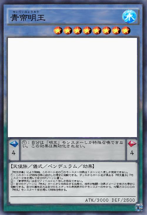 | 「明王供養」により降臨。このカード名の①のモンスター効果は1ターンに1度しか使用できない。 ①:このカードが特殊召喚に成功した場合に発動できる。デッキからカード名が異なる「明王童子」Pモンスター2体を選んで自分のPゾーンに置く。 ②:「青帝明王」は自分フィールドに1体しか存在できない。 ③:自分のPゾーンに「明王」カードが2枚存在する状態で、相手が戦闘・効果ダメージを受けた場合に発動できる。自分の墓地または自分のEXデッキの表側表示のPモンスターの中から、攻撃力3000の「明王」モンスター1体を選んで特殊召喚する。 | |||