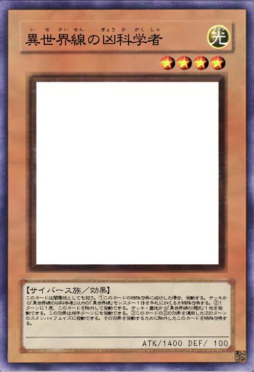 | このカードは闇属性としても扱う。①このカードの特殊召喚に成功した場合、発動する。デッキから「異世界線の凶科学者」以外の「異世界線」モンスター1体を手札に加えるか特殊召喚する。②1ターンに1度、このカードを除外して発動できる。デッキ・墓地から「異世界線の選択」1枚を発動できる。この効果は相手ターンにも発動できる。③このカードの②の効果を適用した次のターンのスタンバイフェイズに発動できる。その効果を発動するために除外したこのカードを特殊召喚する。 | |||