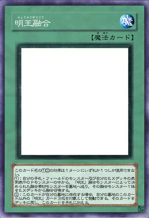 | このカード名の①②の効果は1ターンにいずれか1つしか使用できない。 ①:自分の手札・フィールドのモンスター及び自分のEXデッキの表側表示のPモンスターの中から、「明王」融合モンスターによって決められた融合素材モンスターを墓地へ送り、その融合モンスター1体をEXデッキから融合召喚する。 ②:このカードが自分の墓地に存在する場合、自分の墓地のこのカード以外の「明王」カード3枚を対象として発動できる。そのカードをデッキに戻し、このカードを手札に加える。 | |||