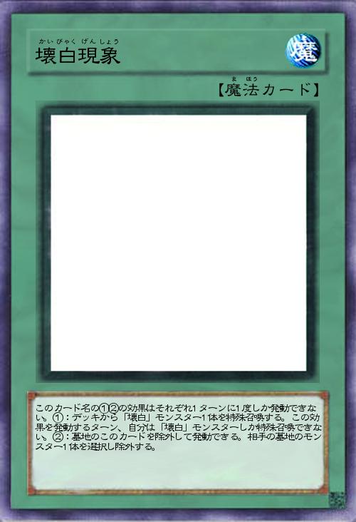 | このカード名の①②の効果はそれぞれ1ターンに1度しか発動できない。①:デッキから「壊白」モンスター1体を特殊召喚する。この効果で特殊召喚されたモンスターは、この効果を発動するターン、自分は「壊白」モンスターしか特殊召喚できない。②:墓地のこのカードを除外して発動できる。相手の墓地のモンスター1体を選択し除外する。 | |||