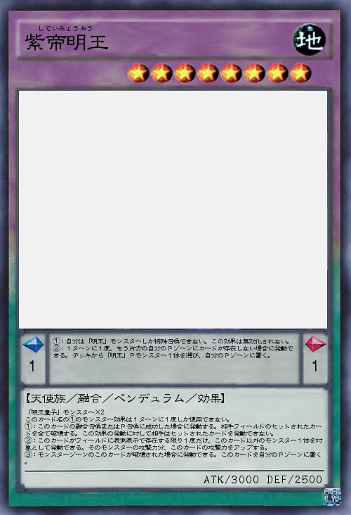 | ①:自分は「明王」モンスターしか特殊召喚できない。この効果は無効化されない。 ②:1ターンに1度、もう片方の自分のPゾーンにカードが存在しない場合に発動できる。デッキから「明王」Pモンスター1体を選び、自分のPゾーンに置く。 | |||