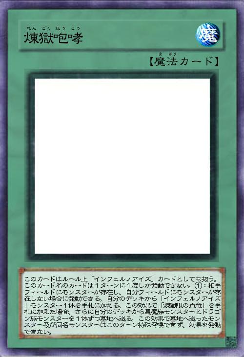 | このカードはルール上「インフェルノアイズ」カードとしても扱う。このカード名のカードは1ターンに1度しか発動できない。①:相手フィールドにモンスターが存在し、自分フィールドにモンスターが存在しない場合に発動できる。自分のデッキから「インフェルノアイズ」モンスター1体を手札に加える。この効果で「煉獄眼の血竜」を手札に加えた場合、さらに自分のデッキから悪魔族モンスターとドラゴン族モンスターを1体ずつ墓地へ送る。この効果で墓地へ送ったモンスター及び同名モンスターはこのターン特殊召喚できず、効果を発動できない。 | |||