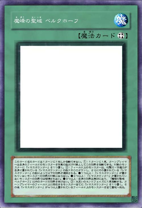 | このカード名のカードは1ターンに1枚しか発動できない。①:1ターンに1度、ターンプレイヤーは自身のフィールドのモンスターを任意の数だけ対象としてこの効果を発動できる。対象のモンスターに「トマスカウンター」を1つ置く。②:フィールド上のモンスターは、攻撃力・守備力が自身に置かれている「トマスカウンター」の数×500ダウンし、さらにその置かれている「トマスカウンター」の数によって以下の効果が適用される。●1つ以上:「トマスカウンター」が置かれていないモンスターの効果の対象にならない。●2つ以上:「トマスカウンター」が置かれていないモンスターの効果では破壊されない。●3つ以上:自身の効果は無効になり、「魔峰の聖域 ベルクホーフ」以外のカードの効果を受けない。③:お互いのエンドフェイズに1度発動する。ターンプレイヤーのフィールド上に存在するモンスター全てに「トマスカウンター」を1つ置く。その後「ト | |||