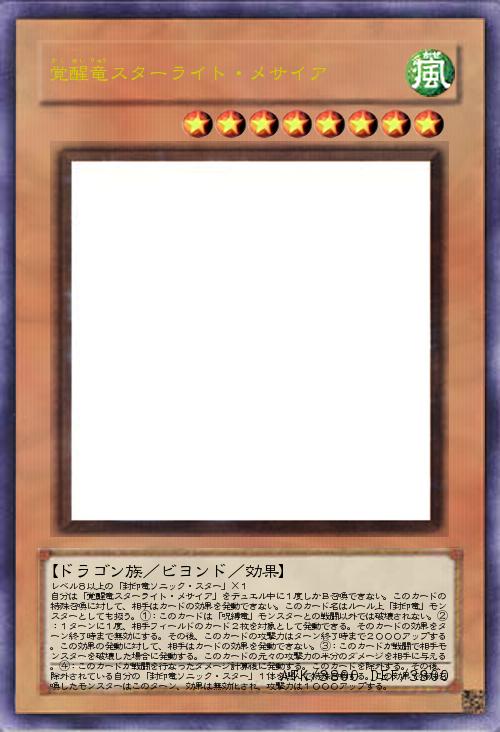 | レベル8以上の「封印竜ソニック・スター」×1 自分は「覚醒竜スターライト・メサイア」をデュエル中に1度しかB召喚できない。このカードの特殊召喚に対して、相手はカードの効果を発動できない。このカード名はルール上「封印竜」モンスターとしても扱う。①:このカードは「呪縛竜」モンスターとの戦闘以外では破壊されない。②:1ターンに1度、相手フィールドのカード2枚を対象として発動できる。そのカードの効果をターン終了時まで無効にする。その後、このカードの攻撃力はターン終了時まで2000アップする。この効果の発動に対して、相手はカードの効果を発動できない。③:このカードが戦闘で相手モンスターを破壊した場合に発動する。このカードの元々の攻撃力の半分のダメージを相手に与える。④:このカードが戦闘を行なったダメージ計算後に発動する。このカードを除外する。その後、除外されている自分の「封印竜ソニック・スター」1体 | |||