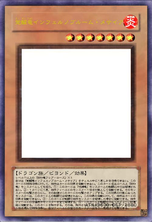 | レベル7以上の「封印竜フレア・ローズ」×1 自分は「覚醒竜インフェルノブルーム・メサイア」をデュエル中に1度しかB召喚できない。このカードの特殊召喚に対して、相手はカードの効果を発動できない。このカード名はルール上「封印竜」モンスターとしても扱う。①:このカードは「呪縛竜」モンスターとの戦闘以外では破壊されない。②:1ターンに1度、相手フィールドのモンスター1体を対象として発動できる。そのモンスターの攻撃力を0にし、その数値分このカードの攻撃力をアップする。この効果の対象になったモンスターは、このカードとの戦闘では破壊されない。この効果の発動に対して、相手はカードの効果を発動できない。③:このカードが戦闘で相手モンスターを破壊した場合に発動できる。相手フィールドの守備表示モンスターを全て破壊する。④:このカードが戦闘を行なったダメージ計算後に発動する。このカードを除外する。その後、除外され | |||