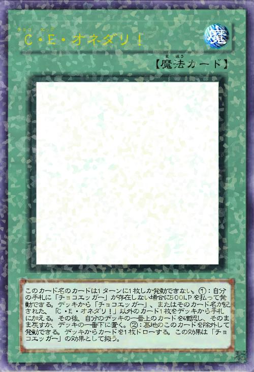 | このカード名のカードは1ターンに1枚しか発動できない。①:自分の手札に「チョコエッガー」が存在しない場合に500LPを払って発動できる。デッキから「チョコエッガー」、またはそのカード名が記された、「C・E・オネダリ!」以外のカード1枚をデッキから手札に加える。その後、自分のデッキの一番上のカードを確認し、そのまま戻すか、デッキの一番下に置く。②:墓地のこのカードを除外して発動できる。デッキからカードを1枚ドローする。この効果は「チョコエッガー」の効果として扱う。 | |||