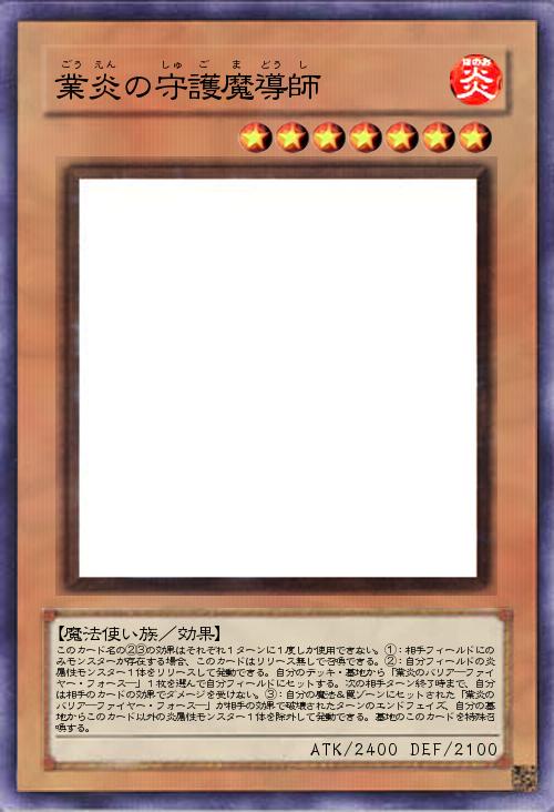 | このカード名の②③の効果はそれぞれ1ターンに1度しか使用できない。①:相手フィールドにのみモンスターが存在する場合、このカードはリリース無しで召喚できる。②:自分フィールドの炎属性モンスター1体をリリースして発動できる。自分のデッキ・墓地から「業炎のバリア―ファイヤー・フォース―」1枚を選んで自分フィールドにセットする。次の相手ターン終了時まで、自分は相手のカードの効果でダメージを受けない。③:自分の魔法&罠ゾーンにセットされた「業炎のバリア―ファイヤー・フォース―」が相手の効果で破壊されたターンのエンドフェイズ、自分の墓地からこのカード以外の炎属性モンスター1体を除外して発動できる。墓地のこのカードを特殊召喚する。 | |||