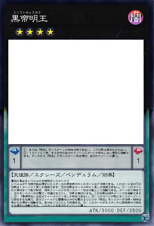 | 属性の異なるレベル4の天使族モンスター×2 レベル4がP召喚可能な場合にEXデッキの表側表示のこのカードはP召喚できる。このカード名の①の効果は1ターンに1度しか使用できず、⑤の効果はデュエル中に1度しか使用できない。①:このカードのX素材を1つ取り除き、相手フィールドのモンスター1体を対象として発動できる。ターン終了時まで、そのモンスターの攻撃力・守備力を0にし、効果を無効にする。この効果は相手ターンでも発動できる。②:「黒帝明王」は自分フィールドに1体しか存在できない。③:このカードが既にモンスターゾーンに存在する状態で、自分フィールドに闇属性以外の攻撃力3000の「明王」モンスターが召喚・特殊召喚された場合に発動する。自分は3000LP回復する。④:このカードがEXデッキに表側表示で存在する場合に発動できる。このカードを自分のPゾーンに置く。 | |||