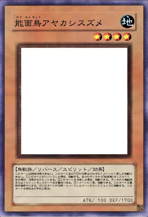 | このカードは特殊召喚できない。このカード名の①②の効果はそれぞれ1ターンに1度しか発動できない。①このカードがリバースした場合、発動する。自分のデッキから「能面鳥」モンスター1体を選び、召喚するかセットする。②このカードを召喚した場合、発動できる。デッキから鳥獣族またはスピリットモンスター1枚を墓地へ送る。③1ターンに1度、発動できる。このカードを裏側守備表示にする。④このカードが召喚・リバースしたターンのエンドフェイズに発動する。このカードを持ち主の手札に戻す。 | |||