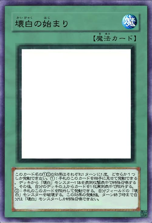 効果は「壊白現象」と同じく特殊召喚する効果。ただしこちらにはデッキの上からカードを一枚除外するデメリット持ち。②は単純に自分フィールドの「壊白」モンスターを破壊する効果。「壊白」モンスターは自分フィールドに1体しか存在できない効果があるので、テキストからは何体破壊するという指定は書きませんでした。こちらは効果発動後のターン終了時まで「壊白」モンスターしか特殊召喚できなくなるデメリットがあります。」(2021-08-24 01:40)