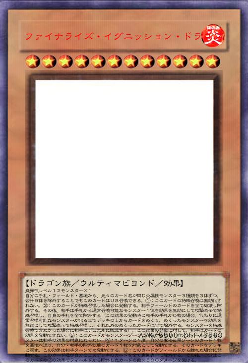 | 炎属性レベル12モンスター×1 自分の手札・フィールド・墓地から、元々のカード名が同じ炎属性モンスター3種類を3体ずつ、合計9体を除外することでもこのカードはUB召喚できる。①:このカードの特殊召喚は無効化されない。②:このカードが特殊召喚した場合に発動する。相手フィールドのカードを全て破壊し除外する。その後、相手は手札から通常召喚可能なモンスター1体を効果を無効にして攻撃表示で特殊召喚し、自身の手札を全て除外する(この効果の発動時に相手の手札が0枚の場合、代わりに通常召喚可能なモンスターが出るまでデッキの上からカードをめくり、めくったモンスターを効果を無効にして攻撃表示で特殊召喚し、それ以外のめくったカードは全て除外する。モンスターを特殊召喚できなかった場合に相手はデュエルに敗北する)。この効果の発動に対して、相手はカードの効果を発動できない。③:このカードがモンスターゾーンに存在する限り、自分フィールドのモンスターは相手の効果の対象にならない。④:1ターンに1度、自分の魔法&罠ゾーンのカード1枚を墓地へ送り、自分・相手の除外状態のカード1枚を対象として発動できる。そのカードをデッキに戻す。この効果は相手ターンでも発動できる。⑤:このカードがフィールドから離れた場合に発動する。このカード及び自分のEXデッキのカードを全て裏側表示で除外する。その後、自分はこのカードの②の効果でフィールドから除外したカードの数×500ダメージを受ける。 | |||