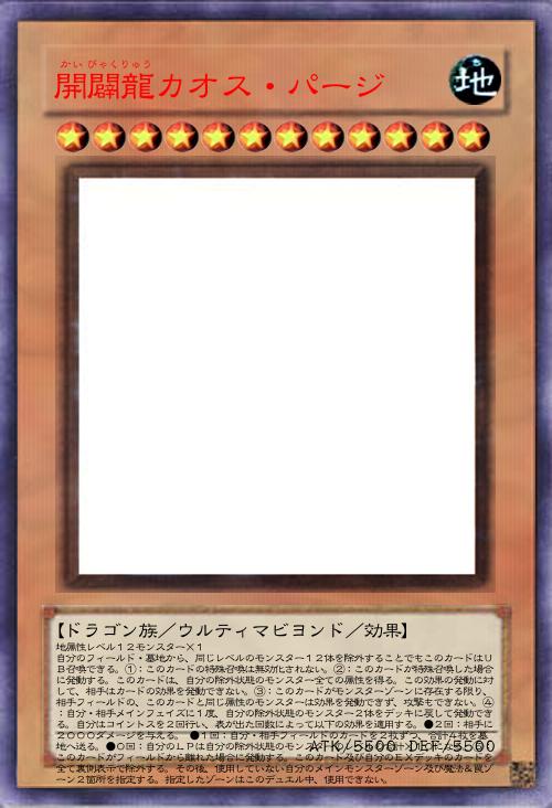 | 地属性レベル12モンスター×1 自分のフィールド・墓地から、同じレベルのモンスター12体を除外することでもこのカードはUB召喚できる。①:このカードの特殊召喚は無効化されない。②:このカードが特殊召喚した場合に発動する。このカードは、自分の除外状態のモンスター全ての属性を得る。この効果の発動に対して、相手はカードの効果を発動できない。③:このカードがモンスターゾーンに存在する限り、相手フィールドの、このカードと同じ属性のモンスターは効果を発動できず、攻撃もできない。④:自分・相手メインフェイズに1度、自分の除外状態のモンスター2体をデッキに戻して発動できる。自分はコイントスを2回行い、表が出た回数によって以下の効果を適用する。●2回:相手に2000ダメージを与える。 ●1回:自分・相手フィールドのカードを2枚ずつ、合計4枚を墓地へ送る。●0回:自分のLPは自分の除外状態のモンスターのレベルの合計×10になる。⑤:このカードがフィールドから離れた場合に発動する。このカード及び自分のEXデッキのカードを全て裏側表示で除外する。その後、使用していない自分のメインモンスターゾーン及び魔法&罠ゾーン2箇所を指定する。指定したゾーンはこのデュエル中、使用できない。 | |||