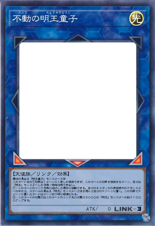 | 属性の異なる「明王童子」モンスター3体 このカード名の①効果は1ターンに1度しか使用できず、このカードの効果を使用するターン、自分は「明王」モンスターしか召喚・特殊召喚できない。 ①:このカードのリンク召喚に成功した場合に発動できる。自分のEXデッキの表側表示のPモンスターの中から、スケールの異なる「明王」モンスター2体を選んで自分のPゾーンに置く。この効果でPゾーンに置いたカードはターン終了時に破壊される。 ②:このカードの攻撃力はこのカードのリンク先に攻撃力3000の「明王」モンスターの数×1000アップする。 | |||