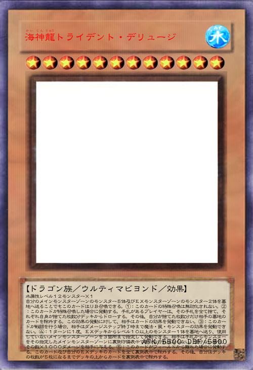 | 水属性レベル12モンスター×1 自分のメインモンスターゾーンのモンスター5体及びEXモンスターゾーンのモンスター2体を墓地へ送ることでもこのカードはUB召喚できる。①:このカードの特殊召喚は無効化されない。②:このカードが特殊召喚した場合に発動する。手札があるプレイヤーは、その手札を全て捨て、それぞれ自身が捨てた枚数分デッキからドローする。その後、自分が捨てた枚数分だけ相手の墓地のカードを除外する。この効果の発動に対して、相手はカードの効果を発動できない。③:このカードが戦闘を行う場合、相手はダメージステップ終了時まで魔法・罠・モンスターの効果を発動できない。④:1ターンに1度、EXデッキからレベル10以上のモンスター1体を墓地へ送り、使用していないメインモンスターゾーンを3箇所まで指定して発動できる。相手は手札からモンスターをその指定したメインモンスターゾーンに裏側守備表示で置かなければならない。置けない場合、その数×1000ダメージを相手に与える。⑤:このカードがフィールドから離れた場合に発動する。このカード及び自分のEXデッキのカードを全て裏側表示で除外する。その後、自分はデッキの枚数が5枚になるまでデッキの上からカードを裏側表示で除外する。 | |||