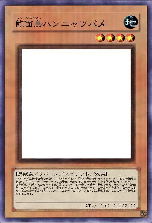 | このカードは特殊召喚できない。このカード名の①②の効果はそれぞれ1ターンに1度しか発動できない。①このカードがリバースした場合、発動する。自分のデッキから「能面鳥」モンスター1体を選び、召喚するかセットする。②このカードを召喚した場合、発動できる。デッキから「能面鳥」カード1枚を手札に加える。③1ターンに1度、発動できる。このカードを裏側守備表示にする。④このカードが召喚・リバースしたターンのエンドフェイズに発動する。このカードを持ち主の手札に戻す。 | |||