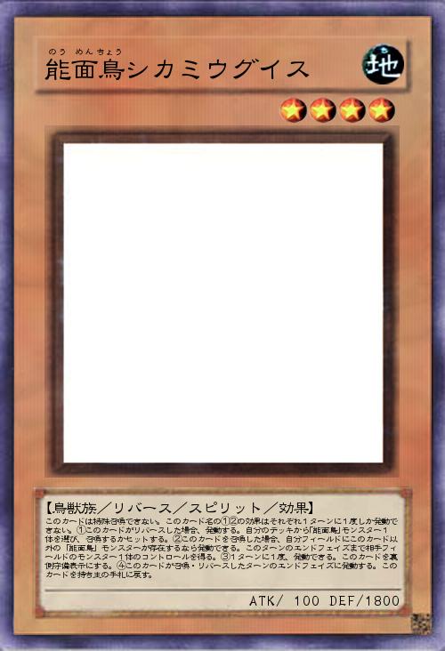 | このカードは特殊召喚できない。このカード名の①②の効果はそれぞれ1ターンに1度しか発動できない。①このカードがリバースした場合、発動する。自分のデッキから「能面鳥」モンスター1体を選び、召喚するかセットする。②このカードを召喚した場合、自分フィールドにこのカード以外の「能面鳥」モンスターが存在するなら発動できる。このターンのエンドフェイズまで相手フィールドのモンスター1体のコントロールを得る。③1ターンに1度、発動できる。このカードを裏側守備表示にする。④このカードが召喚・リバースしたターンのエンドフェイズに発動する。このカードを持ち主の手札に戻す。 | |||