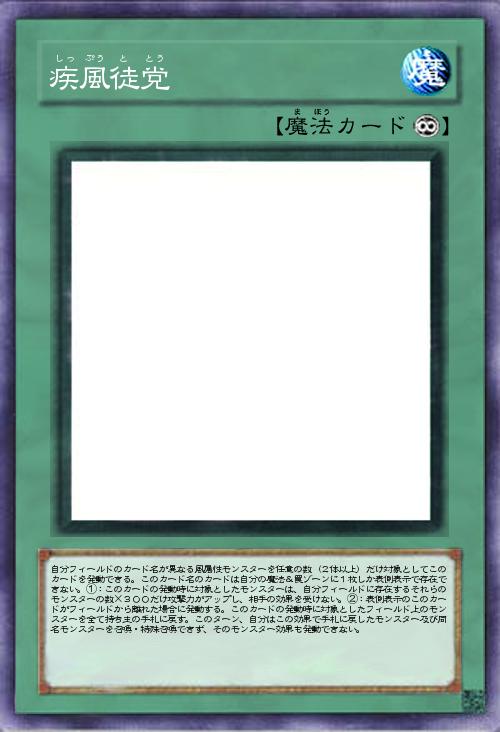 | 自分フィールドのカード名が異なる風属性モンスターを任意の数(2体以上)だけ対象としてこのカードを発動できる。このカード名のカードは自分の魔法&罠ゾーンに1枚しか表側表示で存在できない。①:このカードの発動時に対象としたモンスターは、自分フィールドに存在するそれらのモンスターの数×300だけ攻撃力がアップし、相手の効果を受けない。②:表側表示のこのカードがフィールドから離れた場合に発動する。このカードの発動時に対象としたフィールド上のモンスターを全て持ち主の手札に戻す。このターン、自分はこの効果で手札に戻したモンスター及び同名モンスターを召喚・特殊召喚できず、そのモンスター効果も発動できない。 | |||