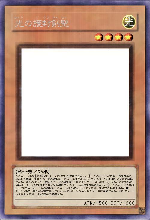 | このカード名の①の効果は1ターンに1度しか使用できない。①:このカードが召喚・特殊召喚に成功した場合、手札から「光の護封剣」のカード名が記されたモンスター1体を相手に見せて発動できる。自分のデッキ・墓地から「光の護封剣」1枚を自分フィールドにセットする。この効果の発動後、ターン終了時まで自分は光属性モンスターしか特殊召喚できない。②:このカードを素材としてX召喚した、「光の護封剣」のカード名が記されたXモンスターは以下の効果を得る。●1ターンに1度、相手が攻撃宣言していない相手ターンのエンドフェイズに発動できる。相手フィールドのモンスター1体を選んで破壊する。 | |||
