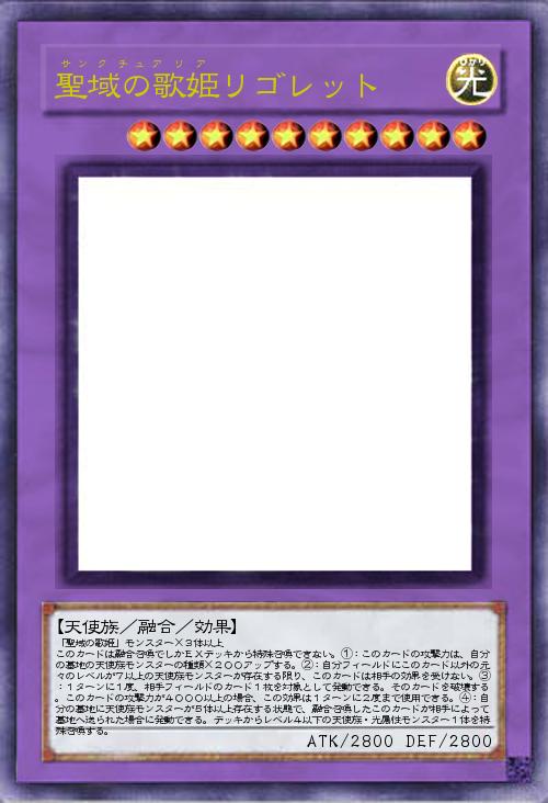 | 「聖域の歌姫」モンスター×3体以上 このカードは融合召喚でしかEXデッキから特殊召喚できない。①:このカードの攻撃力は、自分の墓地の天使族モンスターの種類×200アップする。②:自分フィールドにこのカード以外の元々のレベルが7以上の天使族モンスターが存在する限り、このカードは相手の効果を受けない。③:1ターンに1度、相手フィールドのカード1枚を対象として発動できる。そのカードを破壊する。このカードの攻撃力が4000以上の場合、この効果は1ターンに2度まで使用できる。④:自分の墓地に天使族モンスターが5体以上存在する状態で、融合召喚したこのカードが相手によって墓地へ送られた場合に発動できる。デッキからレベル4以下の天使族・光属性モンスター1体を特殊召喚する。 | |||