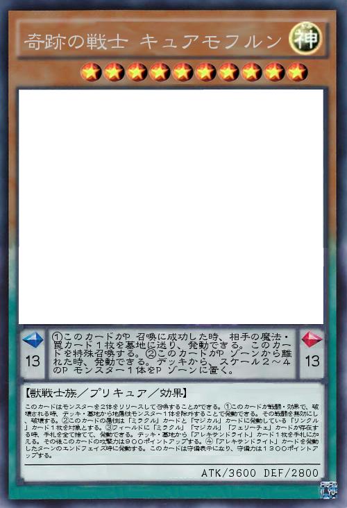 | このカードはモンスターを2体をリリースして召喚することができる。①このカードが戦闘・効果で、破壊される時、デッキ・墓地から地属性モンスター1体を除外することで発動できる。その戦闘を無効にし、破壊する。②このカードの属性は「ミラクル」カードと「マジカル」カードに発動している「リンクル」カード1枚を対象とする。③フィールドに「ミラクル」「マジカル」「フェリーチェ」カードが存在する時、手札を全て捨てて、発動できる。デッキ・墓地から「アレキサンドライト」カード1枚を手札に加える。その後このカードの攻撃力は900ポイントアップする。④「アレキサンドライト」カードを発動したターンのエンドフェイズ時に発動する。このカードは守備表示になり、守備力は1300ポイントアップする。 | |||