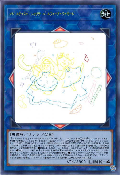 | 「マドルチェ」モンスターを含むモンスター2体以上 このカード名の②の効果は1ターンに1度しか使用できない。①:このカードのカード名はフィールドに存在する限り「マドルチェ・プディンセス」として扱う。②:自分のフィールド・墓地からカードを5枚まで選んで持ち主のデッキに戻す。その後この効果によりデッキに戻した「マドルチェ」カードの数によって下記の効果を適用する。この効果は相手ターンでも発動できる。●1枚以上:このターン、このカードはマドルチェカード以外の効果を受けない。●3枚以上:デッキから「マドルチェ」魔法・罠カードを1枚フィールド上にセットする。この効果でセットしたカードはセットしたターンでも発動できる。●5枚:このカード以外のフィールドの表側表示のカード全てを持ち主のデッキに戻す。③:リンク召喚されたこのカードが相手によってフィールドから離れた場合、フィールド・墓地のカード1枚を選んで持 | |||