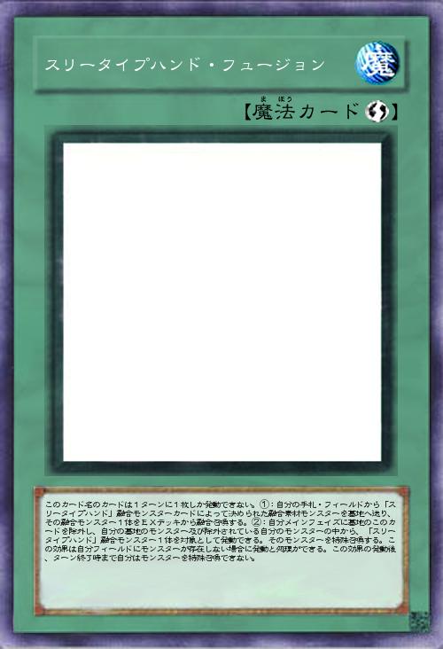 | このカード名のカードは1ターンに1枚しか発動できない。①:自分の手札・フィールドから「スリータイプハンド」融合モンスターカードによって決められた融合素材モンスターを墓地へ送り、その融合モンスター1体をEXデッキから融合召喚する。②:自分メインフェイズに墓地のこのカードを除外し、自分の墓地のモンスター及び除外されている自分のモンスターの中から、「スリータイプハンド」融合モンスター1体を対象として発動できる。そのモンスターを特殊召喚する。この効果は自分フィールドにモンスターが存在しない場合に発動と処理ができる。この効果の発動後、ターン終了時まで自分はモンスターを特殊召喚できない。 | |||