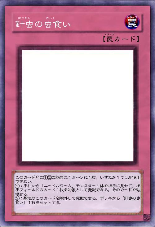 | このカード名の①②の効果は1ターンに1度、いずれか1つしか使用できない。 ①:手札から「ニードルワーム」モンスター1体を相手に見せて、相手フィールドのカード1枚を対象として発動できる。そのカードを破壊する。 ②:墓地のこのカードを除外して発動できる。デッキから「針虫の虫食い」1枚をセットする。 | |||