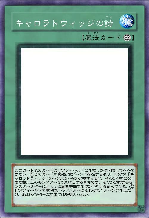 | このカード名のカードは自分フィールドに1枚しか表側表示で存在できない。①このカードが魔法&罠ゾーンに存在する限り、自分が「キャロラトウィッジ」XモンスターをX召喚する場合、そのX召喚に必要な数以上のモンスターをX素材とする事もでき、そのX召喚するモンスターを相手に見せずに裏側守備表示でX召喚する事もできる。②自分フィールドの裏側表示モンスターはそれぞれ1ターンに1度だ け、戦闘及び相手の効果では破壊されない。 | |||