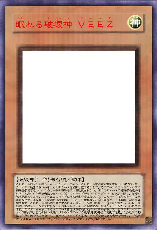 | このカードのレベルはルール上、12として扱う。このカードは通常召喚できない。自分のドローフェイズに通常のドローをしたこのカードを公開し続けることで、そのターンのエンドフェイズに特殊召喚できる。①:このカードの特殊召喚は無効化されない。②:このカードの特殊召喚成功時には、お互いに効果を発動できない。③:このカードがモンスターゾーンに存在する限り、自分の除外状態のUBモンスターはこのカード以外の効果を受けない。④:このカードは他のカードの効果を受けず、このカードの効果以外ではフィールドを離れない。⑤:このカードは戦闘・効果で破壊されず、このカードの戦闘で発生するお互いのダメージは0になる。⑥:自分が1500以上の戦闘・効果ダメージを受けたターンのエンドフェイズに発動する。受けたダメージ1500につき1枚、EXデッキからUBモンスター1体をUB召喚した扱いで除外する。⑦:自分スタンバイフェイズ開始時、自分の除外状態のUBモンスターが5種類以上の場合に発動できる(この効果の発動と効果は無効化されない)。自分のフィールド・墓地のカードを全て裏側表示で除外し、「破壊神 VEEZ」1体をリバイブ召喚扱いでリバイブデッキから特殊召喚する。 | |||