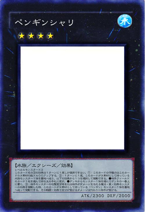 | レベル4モンスター×2 このカード名の③の効果は1ターンに1度しか使用できない。①:このカードの守備力はこのカードのX素材の数×400アップする。②:1ターンに1度、このカードがX素材として持っている水族モンスター1体を墓地へ送り、以下の効果から1つを選択して発動できる。●相手フィールドのカード1枚を選んで持ち主の手札に戻す。●デッキからモンスター1体を選んでデッキの一番上に置く。③:相手モンスターの攻撃宣言時または相手がダメージを与える魔法・罠・効果モンスターの効果を発動した時、このカードがX素材として持っている「ペンギン」モンスター1体を墓地へ送って発動できる。その戦闘・効果で自分が受けるダメージは代わりに相手が受ける。 | |||