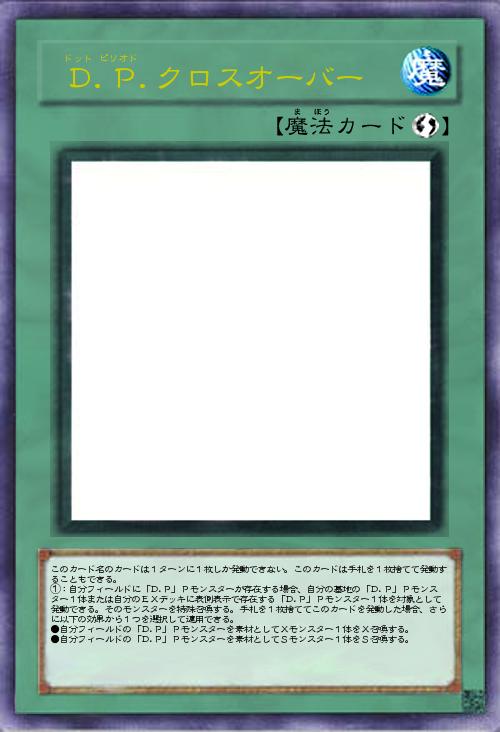 | このカード名のカードは1ターンに1枚しか発動できない。このカードは手札を1枚捨てて発動することもできる。 ①:自分フィールドに「D.P」Pモンスターが存在する場合、自分の墓地の「D.P」Pモンスター1体または自分のEXデッキに表側表示で存在する「D.P」Pモンスター1体を対象として発動できる。そのモンスターを特殊召喚する。手札を1枚捨ててこのカードを発動した場合、さらに以下の効果から1つを選択して適用できる。 ●自分フィールドの「D.P」Pモンスターを素材としてXモンスター1体をX召喚する。 ●自分フィールドの「D.P」Pモンスターを素材としてSモンスター1体をS召喚する。 | |||