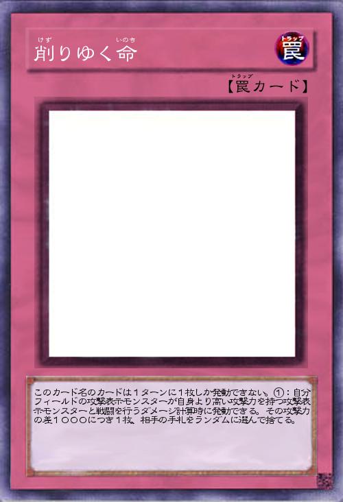 | このカード名のカードは1ターンに1枚しか発動できない。①:自分フィールドの攻撃表示モンスターが自身より高い攻撃力を持つ攻撃表示モンスターと戦闘を行うダメージ計算時に発動できる。その攻撃力の差1000につき1枚、相手の手札をランダムに選んで捨てる。 | |||
