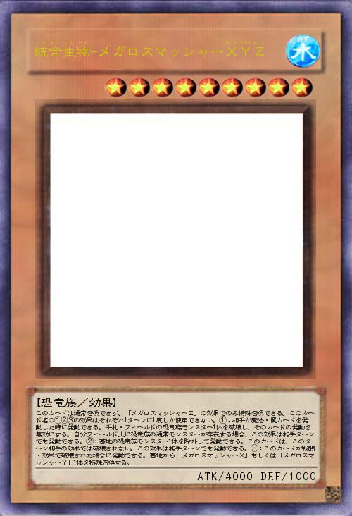 | このカードは通常召喚できず、「メガロスマッシャーZ」の効果でのみ特殊召喚できる。このカード名の①②③の効果はそれぞれ1ターンに1度しか使用できない。①:相手が魔法・罠カードを発動した時に発動できる。手札・フィールドの恐竜族モンスター1体を破壊し、そのカードの発動を無効にする。自分フィールド上に恐竜族の通常モンスターが存在する場合、この効果は相手ターンでも発動できる。②:墓地の恐竜族モンスター1体を除外して発動できる。このカードは、このターン相手の効果では破壊されない。この効果は相手ターンでも発動できる。③:このカードが戦闘・効果で破壊された場合に発動できる。墓地から「メガロスマッシャーX」もしくは「メガロスマッシャーY」1体を特殊召喚する。 | |||