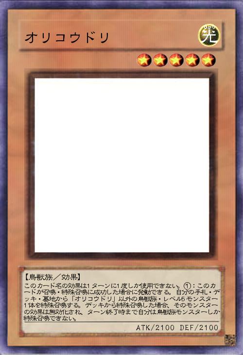| このカード名の効果は1ターンに1度しか使用できない。①:このカードが召喚・特殊召喚に成功した場合に発動できる。自分の手札・デッキ・墓地から「オリコウドリ」以外の鳥獣族・レベル5モンスター1体を特殊召喚する。デッキから特殊召喚した場合、そのモンスターの効果は無効化され、ターン終了時まで自分は鳥獣族モンスターしか特殊召喚できない。 | |||