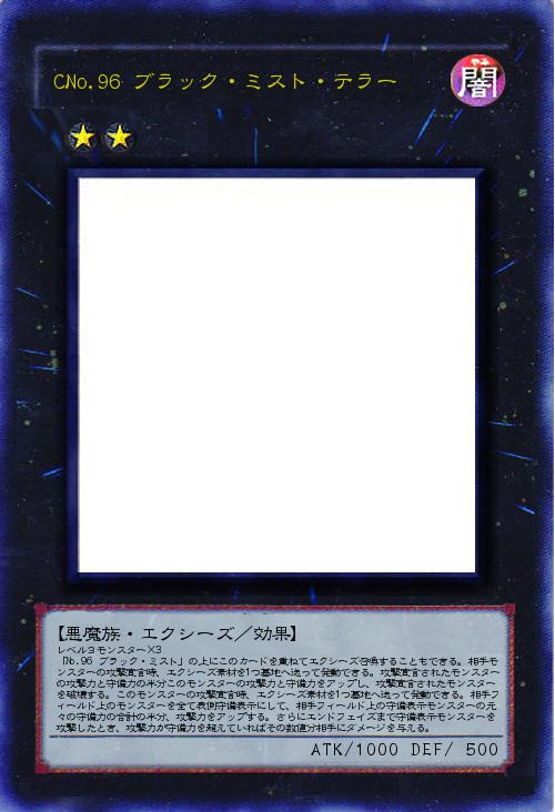 レベル3モンスター×3 「No.96 ブラック・ミスト」の上にこのカードを重ねてエクシーズ召喚することもできる。相手モンスターの攻撃宣言時、エクシーズ素材を1つ墓地へ送って発動できる。攻撃宣言されたモンスターの攻撃力と守備力の半分このモンスターの攻撃力と守備力をアップし、攻撃宣言されたモンスターを破壊する。このモンスターの攻撃宣言時、エクシーズ素材を1つ墓地へ送って発動できる。相手フィールド上のモンスターを全て表側守備表示にして、相手フィールド上の守備表示モンスターの元々の守備力の合計の半分、攻撃力をアップする。さらにエンドフェイズまで守備表示モンスターを攻撃したとき、攻撃力が守備力を超えていればその数値分相手にダメージを与える。 |